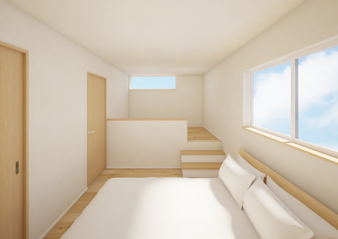 寝室には1段上がった多目的スペースを。読書や書斎、ヨガなど多目的に使えます。