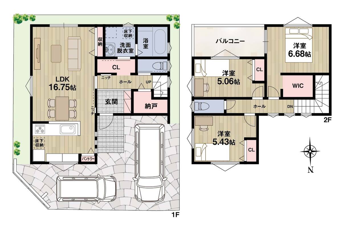 | 建物面積 | 89.43m2(27.05坪)・89.44m2(27.05坪) | 土地面積 | 100.07m2(30.27坪)~121.88m2(36.86坪) |