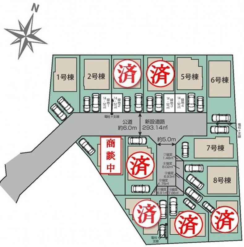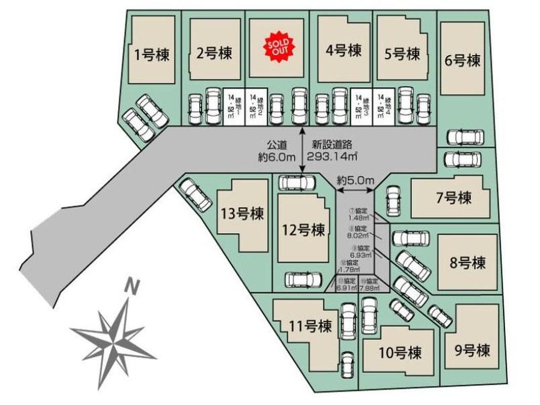 | 駐車場 | 1台 ~ 2台(1台(6・13号棟)、2台(1・2・5・7・8・9・11・12号棟※車種による)) | 道路の幅員 | 道路幅:6m、アスファルト舗装、新設道路約6m公道 |