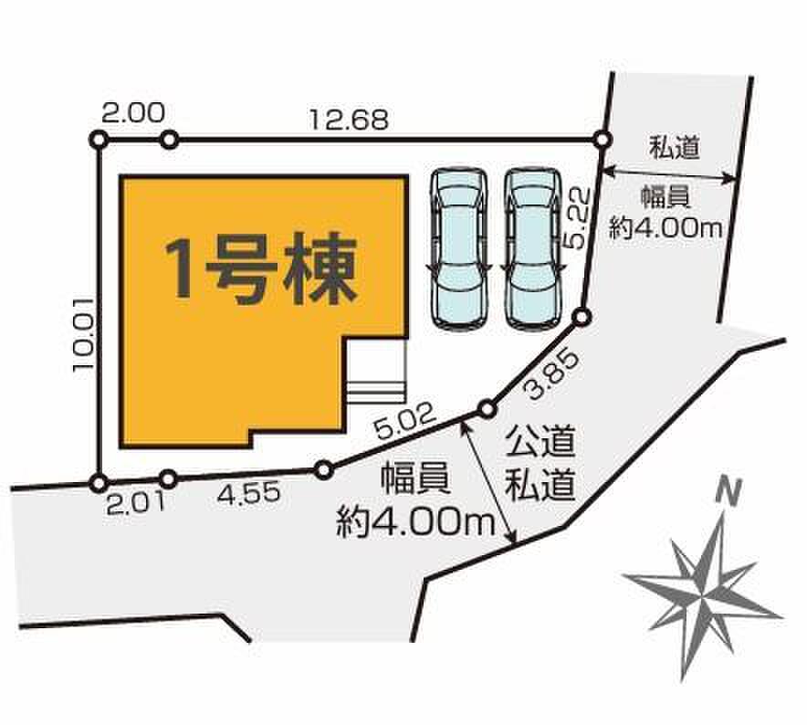 | 駐車場 | 2台 | 道路の幅員 | 道路幅:4m、アスファルト舗装、南側約4.0m公道私道、東側約4.0m私道 |
