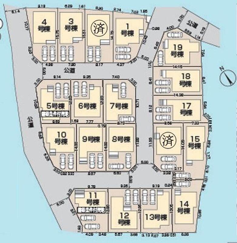 | 駐車場 | 1台 ~ 2台(1台(2戸)、2台(13戸)) | 道路の幅員 | 道路幅:5m・6m、アスファルト舗装、北東側6m公道、北西側4m公道、中央側5m公道 |