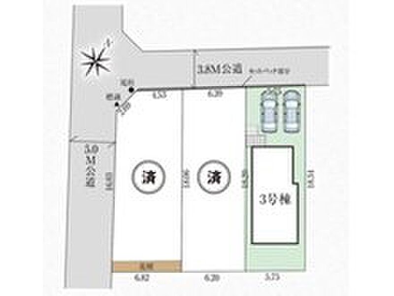 | 駐車場 | 2台(車種による) | 道路の幅員 | 道路幅:3.6m・5m、アスファルト舗装、北西側3.6m公道、南西側5.0m公道 |