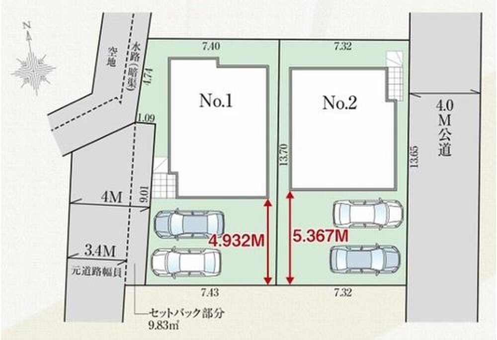 | 駐車場 | 2台 | 道路の幅員 | 道路幅:4m・4.5m、アスファルト舗装、西側 4.5m 公道、東側 4.08m 公道 |