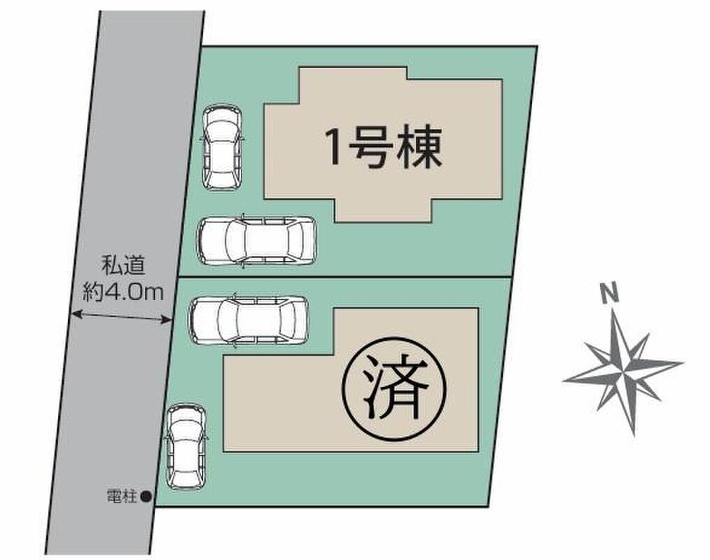 | 駐車場 | 2台(軽自動車1台) | 道路の幅員 | 道路幅:4m、アスファルト舗装、西 4m 私道 |