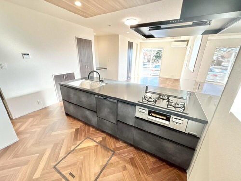 収納力豊富でお手入れもしやすいシステムキッチンを採用しております。食洗機付きで家事の時短も叶います。