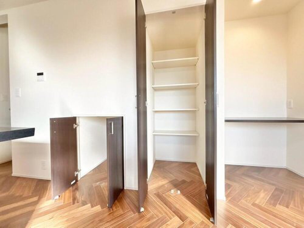 キッチンのすぐ横の収納スペースはミネラルウォーターや調味料などの置き場所に最適♪ハンガーパイプもついているのでファミリークロークとしてもお使いいただけます。