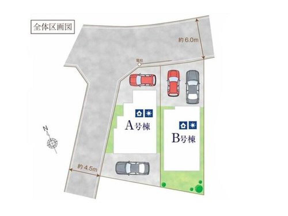| 駐車場 | 2台(車種による) | 道路の幅員 | 道路幅:4.5m・6m、アスファルト舗装、 北 6m 公道、西 4.5m 公道 |