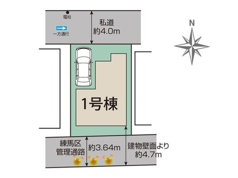 | 駐車場 | 1台 | 道路の幅員 | 道路幅:4m、アスファルト舗装、北側約4.0m私道、南側約3.64m区有通路 |