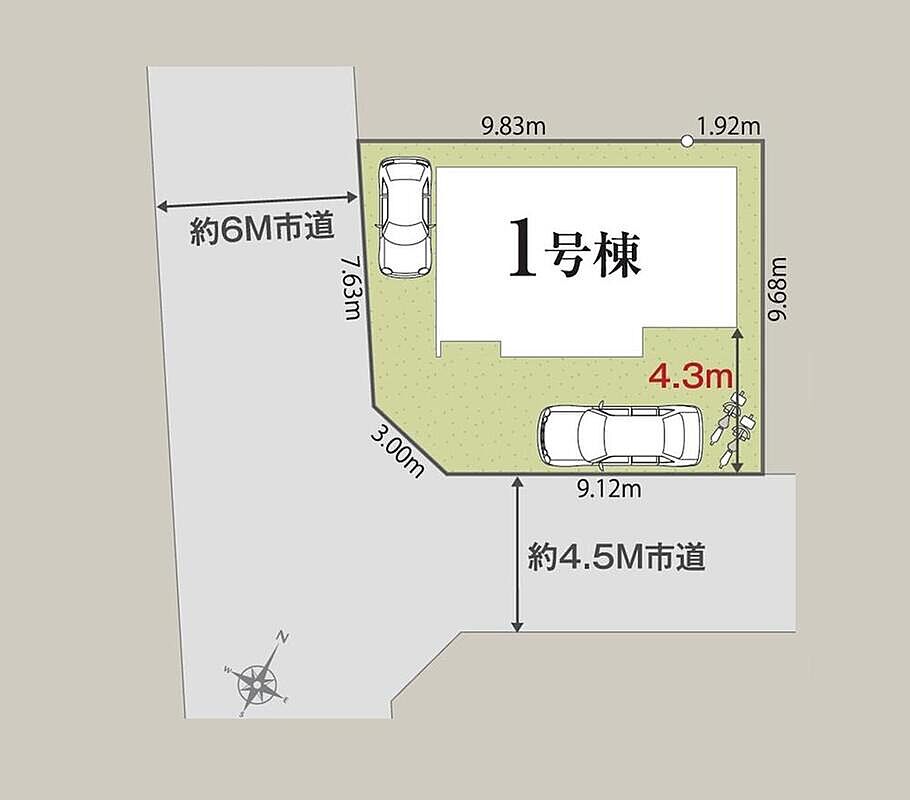 | 駐車場 | 2台 | 道路の幅員 | 道路幅:4.5m・6m、アスファルト舗装、南側約4.5m公道、西側約6m公道 |