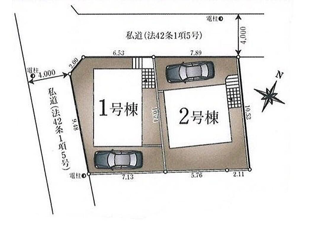 | 駐車場 | 1台 | 道路の幅員 | 道路幅:4m、アスファルト舗装、北側約4.0m私道、西側約4.0m私道 |