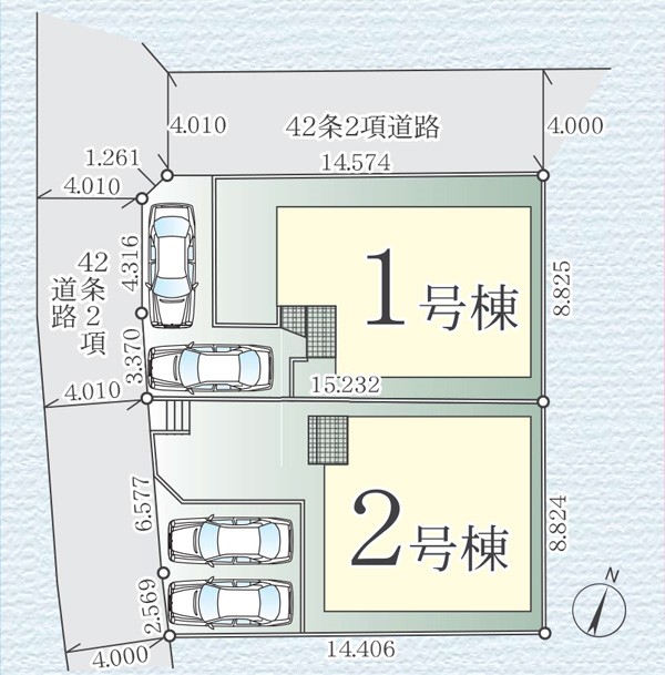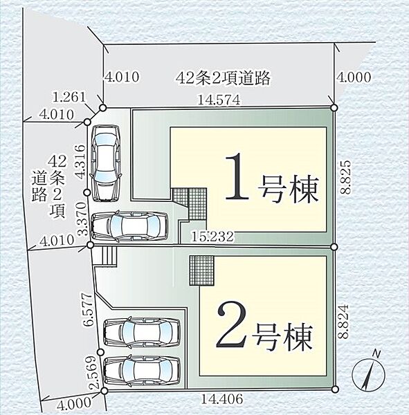 | 駐車場 | 2台 | 道路の幅員 | 1号棟:南西4m 北西4m |