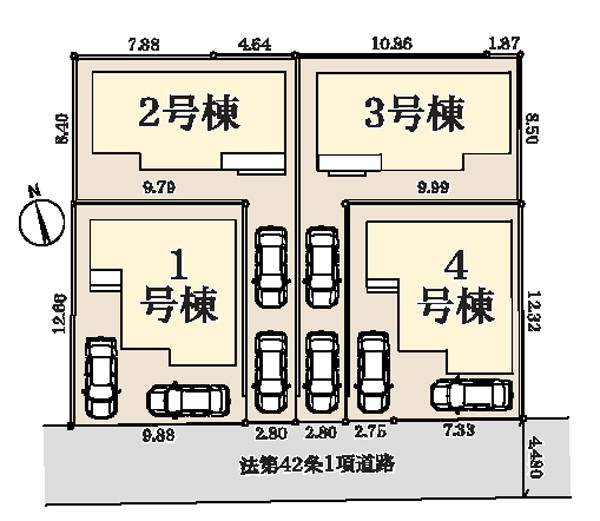 | 駐車場 | 2台 | 道路の幅員 | 2号棟:南西4.4m /4号棟:南西4.4m /1号棟:南西4.4m /3号棟:南西4.4m |