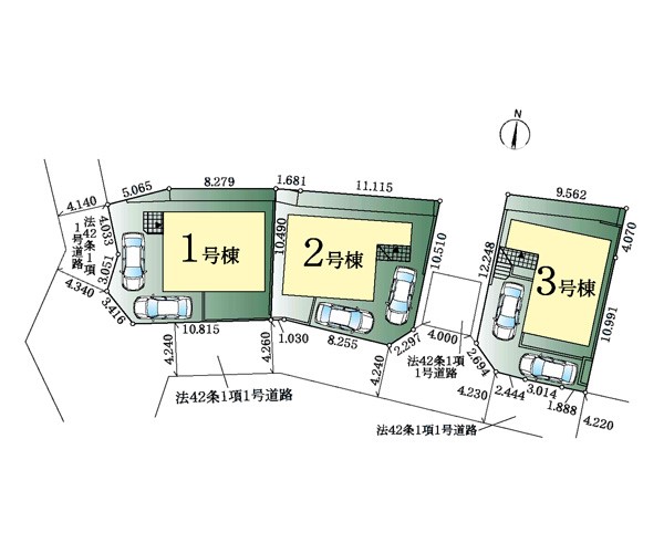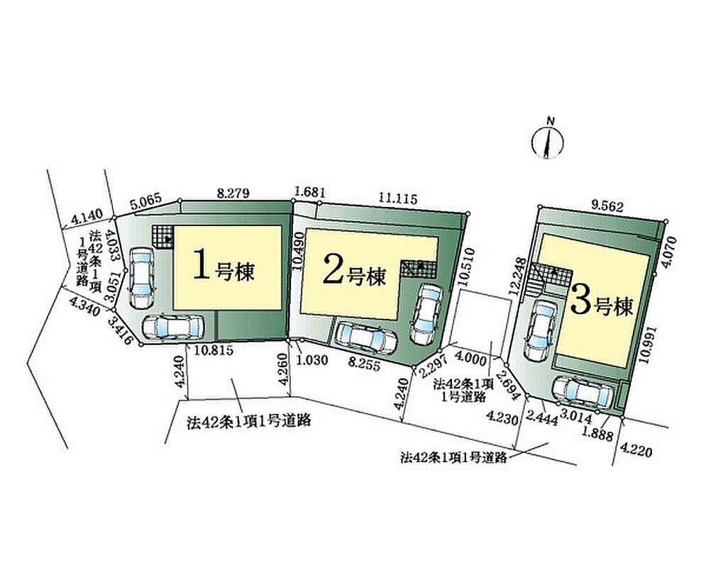 | 駐車場 | 2台 | 道路の幅員 | 2号棟:南4.2m /3号棟:南4.2m /1号棟:西4.3m 南4.2m |