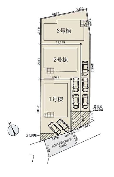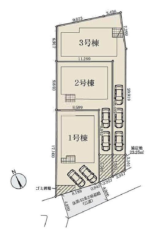 | 駐車場 | 2台 ~ 3台 | 道路の幅員 | 1号棟:南4m /2号棟:南4m /3号棟:南4m |