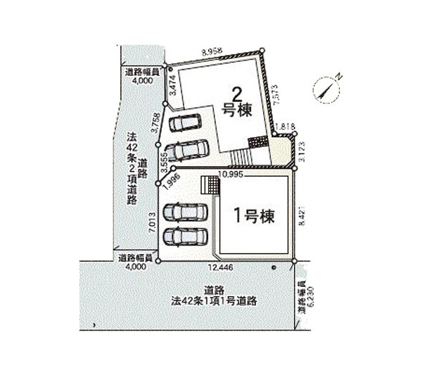 | 駐車場 | 2台 | 道路の幅員 | 2号棟:南西4m /1号棟:南西4m 南東6.2m |