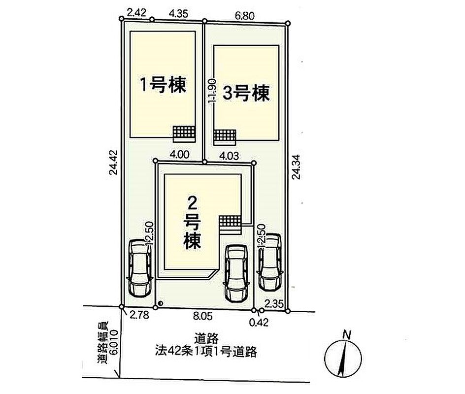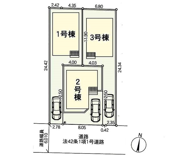 | 駐車場 | 1台 | 道路の幅員 | 2号棟:南6m /1号棟:南6m /3号棟:南6m |