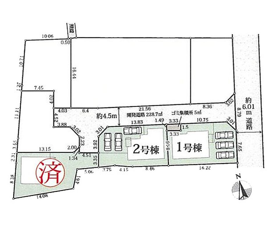 | 駐車場 | 3台 | 道路の幅員 | 1号棟:北4.5m 東6m /2号棟:北4.5m |