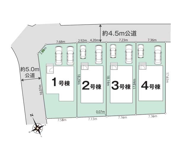 | 駐車場 | 2台 | 道路の幅員 | 3号棟:北4.5m /4号棟:北4.5m /2号棟:北4.5m /1号棟:北4.5m 西5m |