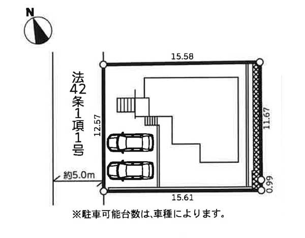 | 駐車場 | 2台 | 道路の幅員 | :西5m |