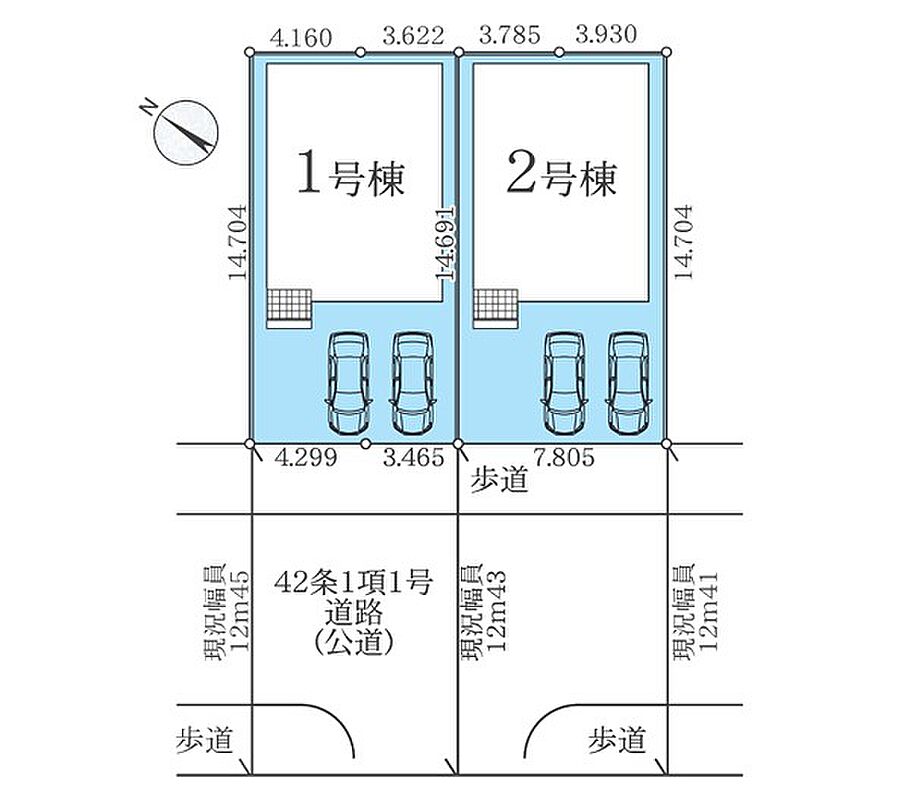 | 駐車場 | 2台 | 道路の幅員 | 1号棟:南西12.4m /2号棟:南西12.4m |