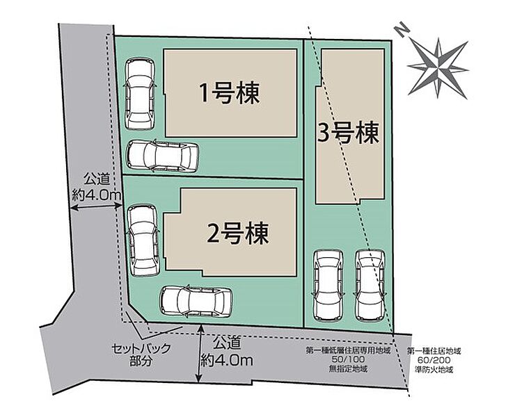 | 駐車場 | 2台 | 道路の幅員 | 2号棟:北西4m 南西4m |