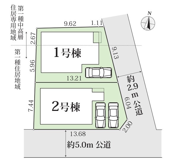| 駐車場 | 2台 | 道路の幅員 | 2号棟:東2.9m 南5m |