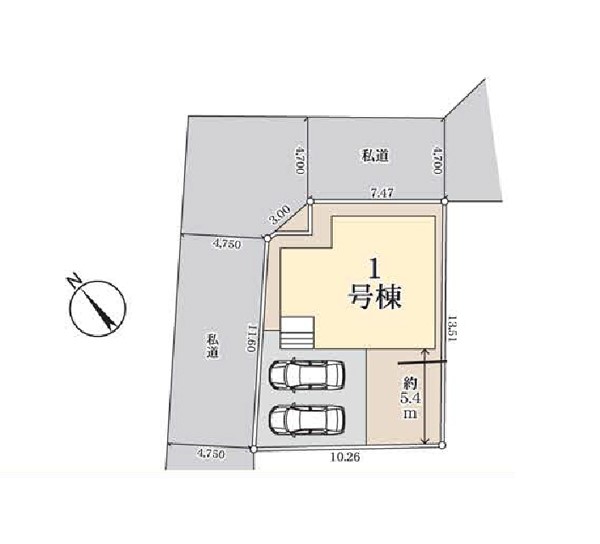 | 駐車場 | 2台 | 道路の幅員 | 1号棟:南西4.7m 北西4.7m |