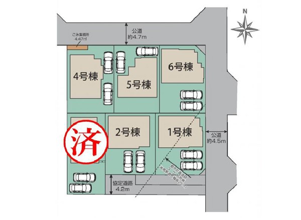 | 駐車場 | 2台 | 道路の幅員 | 6号棟:北4.7m /2号棟:東4.5m /5号棟:北4.7m /4号棟:北4.7m /1号棟:東4.5m |
