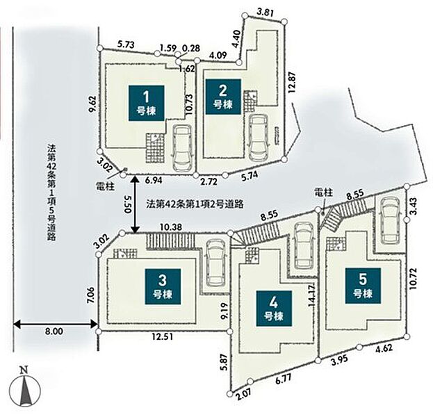 | 駐車場 | 1台 | 道路の幅員 | 5号棟:北5.5m /4号棟:北5.5m /2号棟:南5.5m /1号棟:南5.5m 西8m |