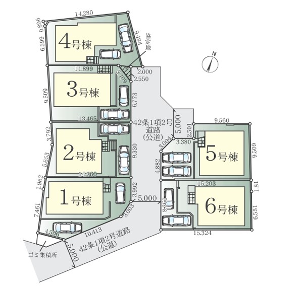 | 駐車場 | 2台 | 道路の幅員 | 3号棟:北東5m /1号棟:北東5m 南東5m /6号棟:南西5m /5号棟:南西5m /2号棟:北東5m /4号棟:南東5m |