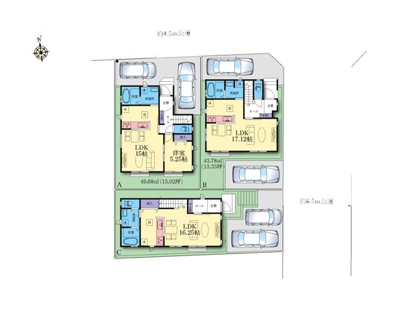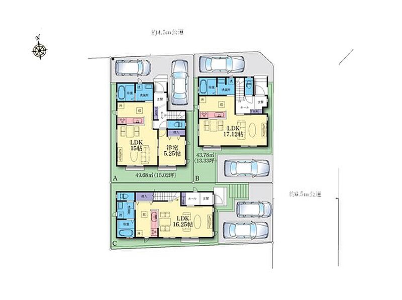 | 駐車場 | 2台 | 道路の幅員 | A号棟:北4.5m /B号棟:北4.5m 東6.5m /C号棟:東6.5m |