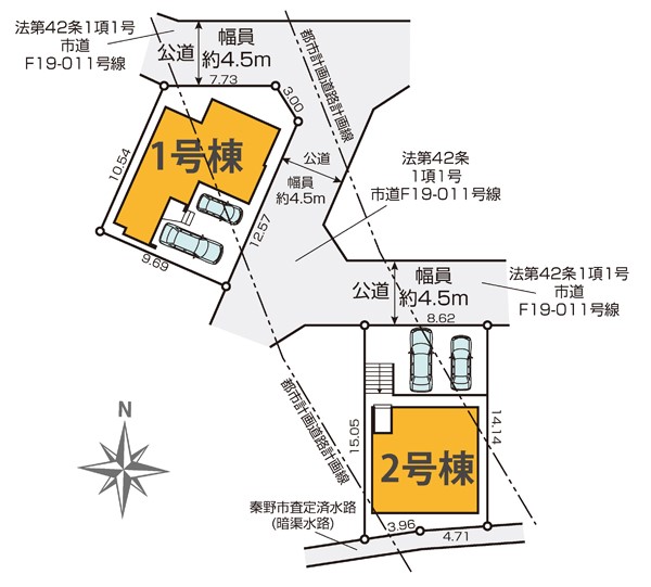 | 駐車場 | 2台 | 道路の幅員 | 2号棟:北4.5m /1号棟:北4.5m 東4.5m |