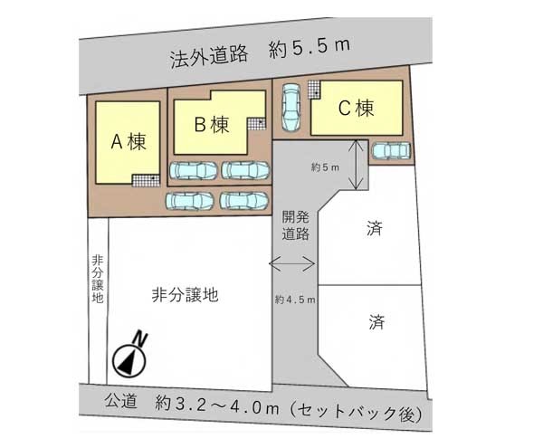 | 駐車場 | 2台 | 道路の幅員 | A棟:東4.5m /C棟:南4.5m /B棟:東4.5m |