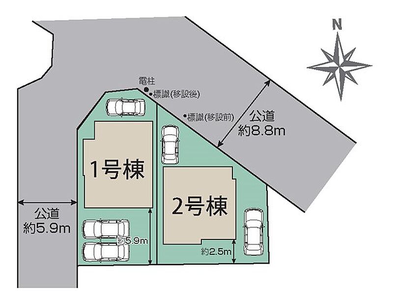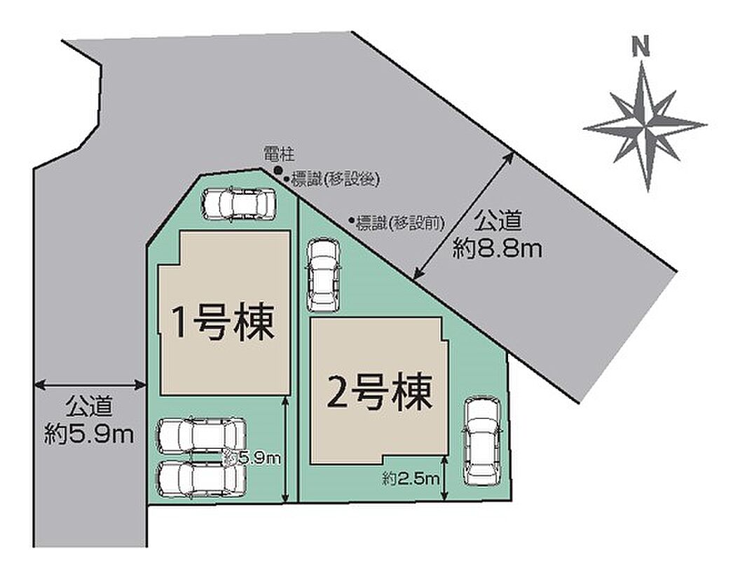 | 駐車場 | 2台 ~ 3台 | 道路の幅員 | 2号棟:北東8.8m /1号棟:北東8.8m 西5.9m |