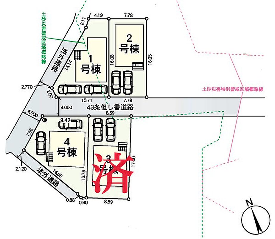 | 駐車場 | 2台 | 道路の幅員 | 4号棟:北4m 北西2.7m /2号棟:南4m /1号棟:南4m 北西2.7m |