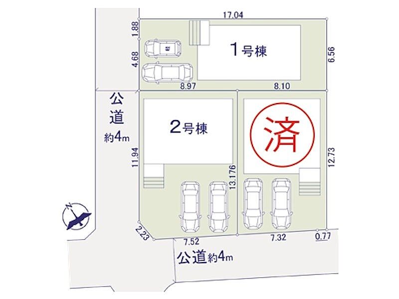 | 駐車場 | 2台 | 道路の幅員 | 2号棟:南西4m 北西4m /1号棟:北西4m |