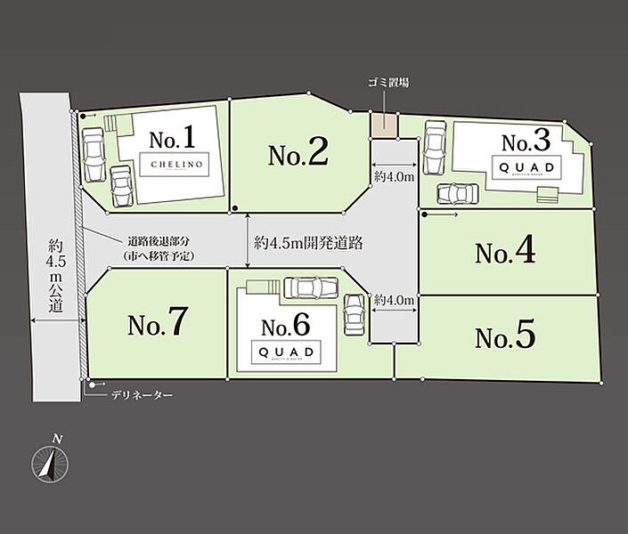 | 駐車場 | 2台 | 道路の幅員 | 6号棟:北西4.5m /3号棟:南西4.5m /1号棟:西4.5m 南東4.5m |