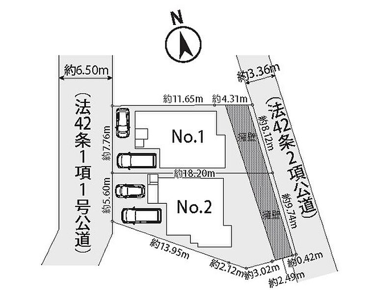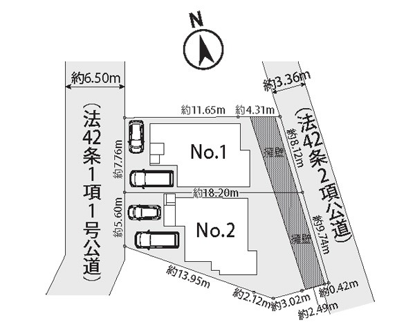 | 駐車場 | 2台 | 道路の幅員 | 2号棟:西6.5m 東4m /1号棟:西6.5m 東4m |