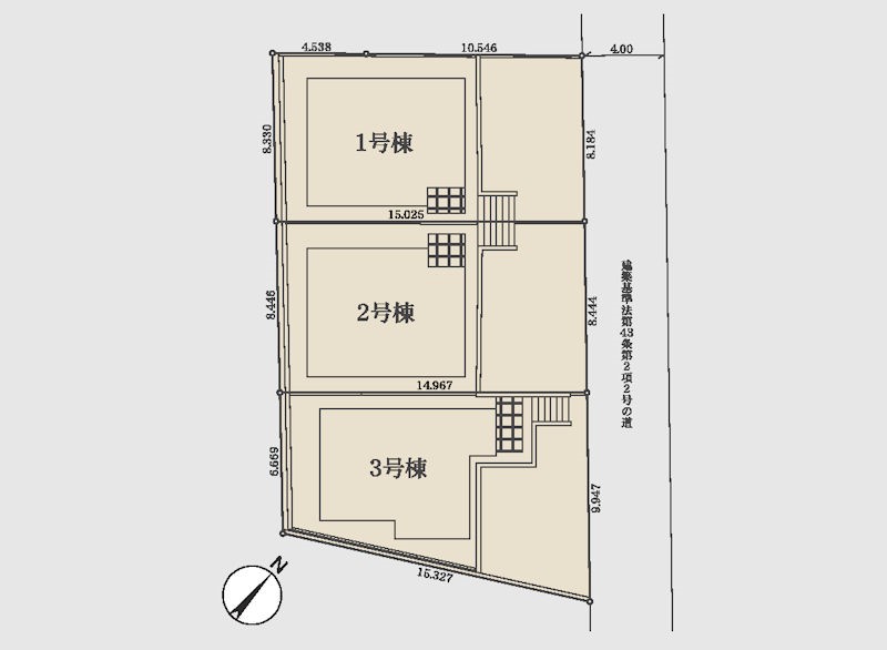 | 駐車場 | 1台 | 道路の幅員 | 1号棟:北東4m /2号棟:北東4m /3号棟:北東4m |