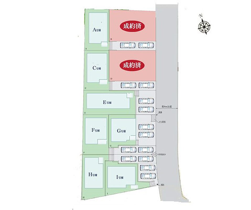 | 駐車場 | 2台 | 道路の幅員 | I号棟:東4m /E号棟:東4m /H号棟:東4m |