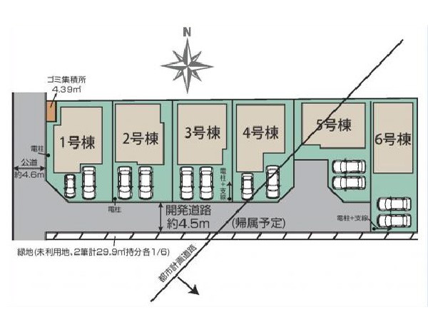 | 駐車場 | 2台 | 道路の幅員 | 2号棟:南4.5m /4号棟:南4.5m /1号棟:南4.5m 西4.6m /6号棟:西4.5m /3号棟:南4.5m /5号棟:南4.5m |