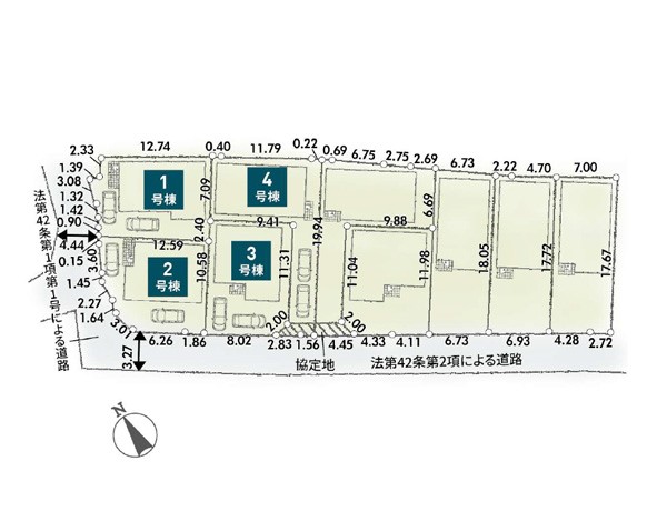 | 駐車場 | 2台 | 道路の幅員 | 2号棟:北西4.4m 南西3.2m /3号棟:南西3.2m /1号棟:北西4.4m /4号棟:南西3.2m |