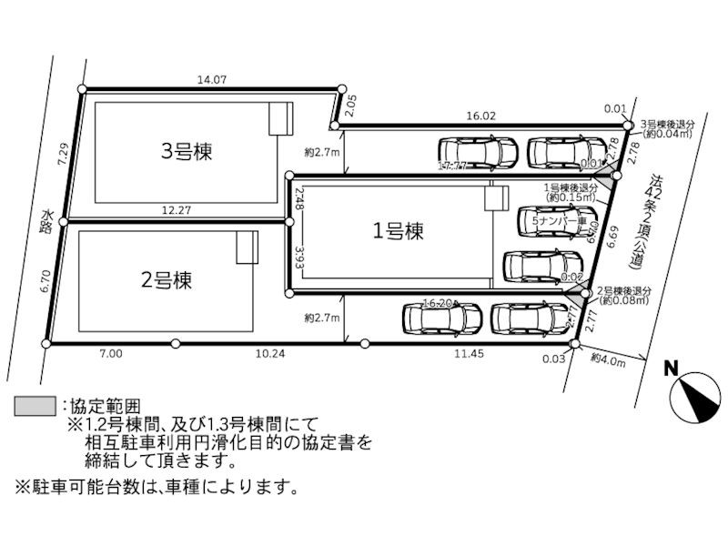 | 駐車場 | 2台 | 道路の幅員 | 2号棟:南東4m /1号棟:南東4m /3号棟:南東4m |