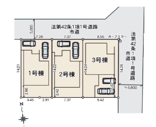 | 駐車場 | 2台 | 道路の幅員 | 2号棟:北5m |