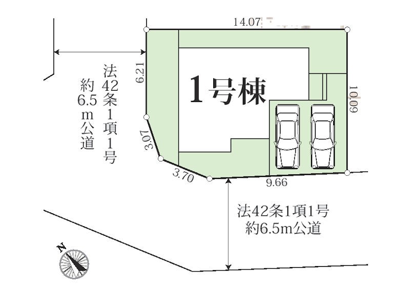 | 駐車場 | 2台 | 道路の幅員 | 1号棟:南西6.5m 北西6.5m |