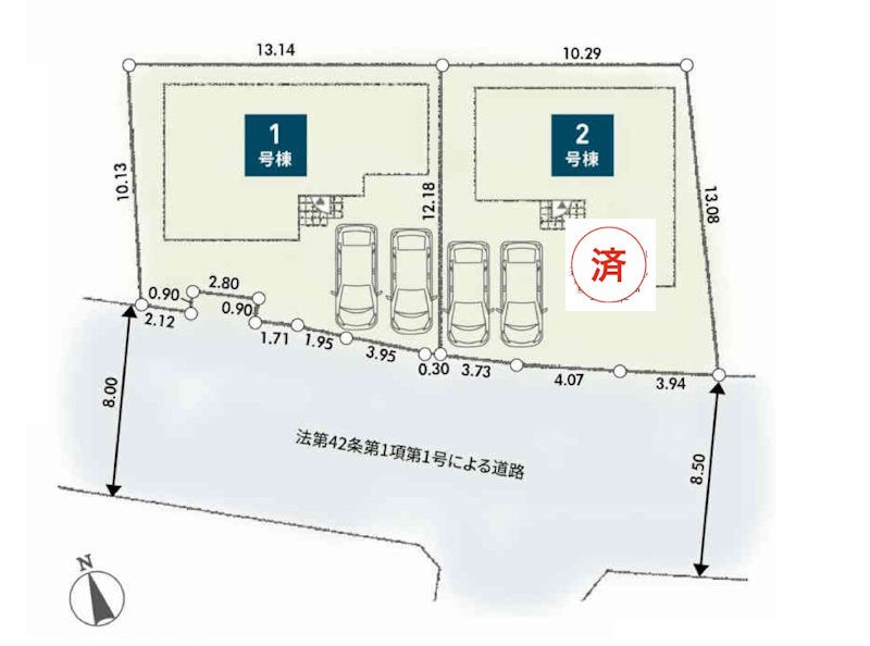 | 駐車場 | 2台 | 道路の幅員 | 1号棟:南8m |