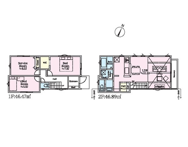 | 建物面積 | 93.36m2~94.81m2 | 土地面積 | 120.27m2~121.02m2<私道負担面積444m2 私道負担割合1/45> |