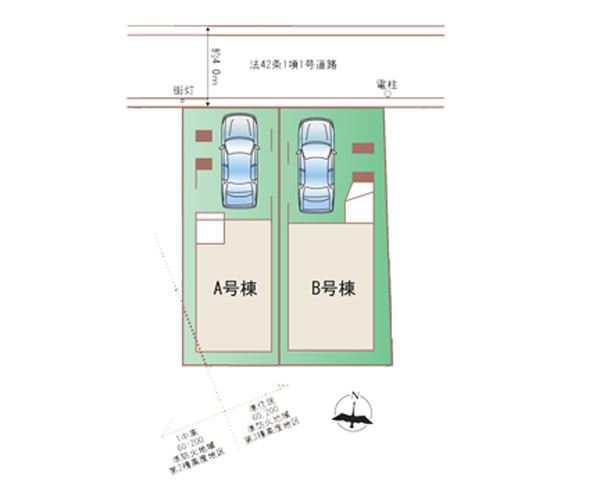 | 駐車場 | 1台 | 道路の幅員 | A号棟:北4m /B号棟:北4m |