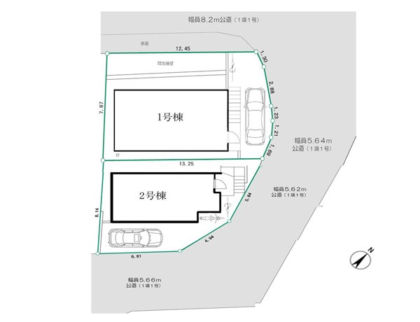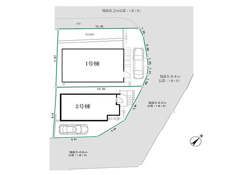 | 駐車場 | 1台 | 道路の幅員 | 2号棟:南東5.6m 北東5.6m /1号棟:北西8.2m 北東5.6m |