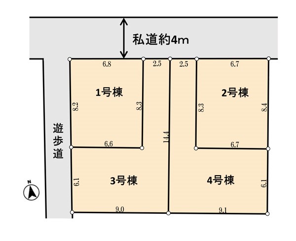 | 駐車場 | 1台 | 道路の幅員 | 1号棟:北4m /2号棟:北4m /4号棟:北4m |